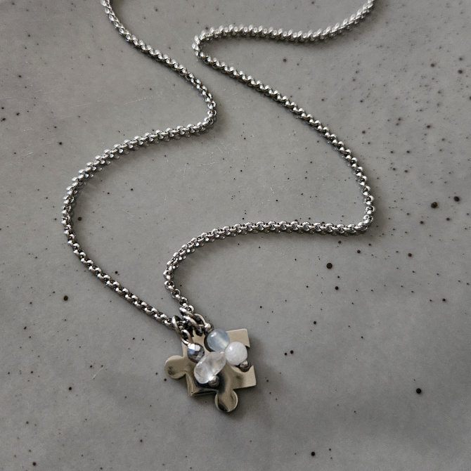 119,00 złNaszyjnik z modnym motywem puzzla z dodatkiem minerałów w odcieniach bieli i błękitu.
