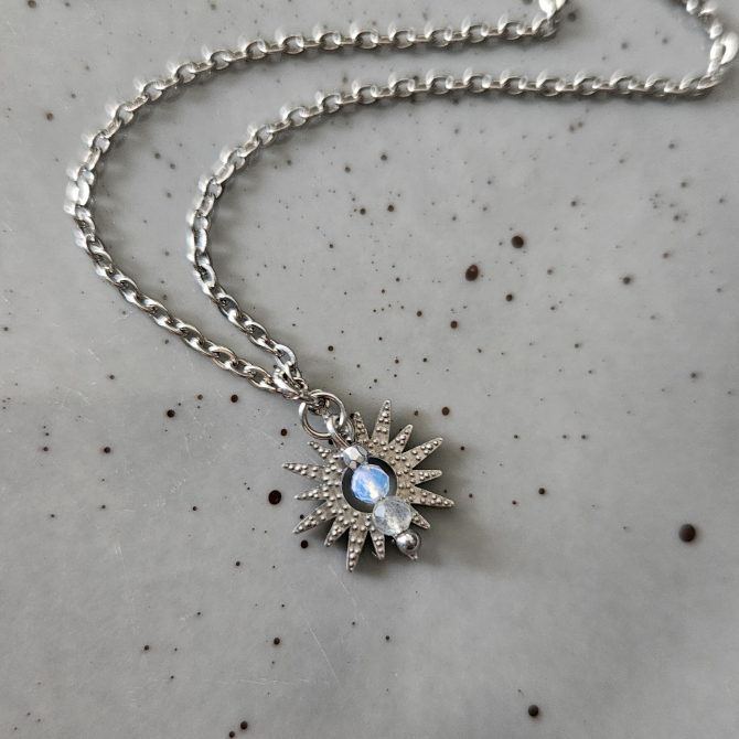 Motyw słońca w formie zawieszki uzupełniony został błyszczącymi, fasetowanymi minerałami – labradorytem i opalem. Te same kamienie przyozdobiły także łańcuszek regulacyjny. Ten prosty, ale niezwykle efektowny naszyjnik zrobi wrażenie zarówno zdobiąc dekolt, jak i plecy w odkrytych, letnich stylizacjach.
