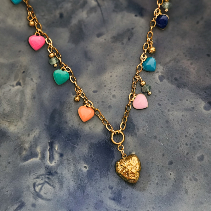 135,00 złKolorowy, beztroski, wiosenny! A do tego zgodny z najnowszymi trendami w biżuterii. Taki właśnie jest naszyjnik z zawieszką – sercem ze stali szlachetnej oraz uroczymi, kolorowymi emaliowanym serduszkami. Dodatkowo w łańcuszek wplecione zostały stalowe kuleczki i to, co najważniejsze – pięknie lśniące fasetowane akwamaryny. Całość zamyka modne zapięcie toggle.