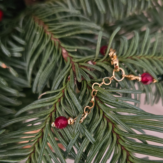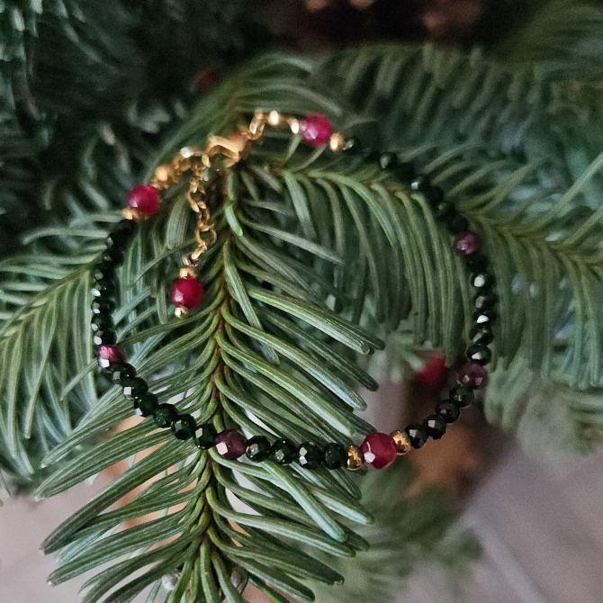 Elegancka bransoletka w świątecznym klimacie, łącząca w sobie szmaragd Nilu, jadeit i granat.
