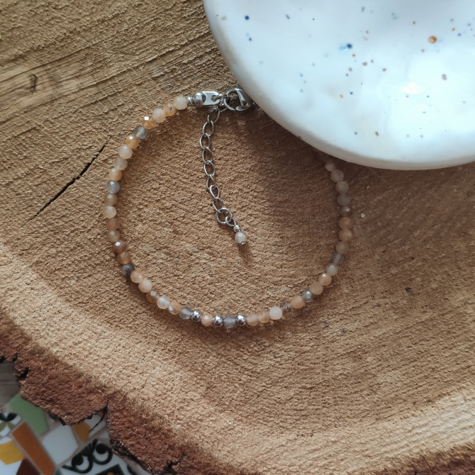 Złocisty obsydian jest minerałem o stonowanej, bardzo nieoczywistej barwie łączącej ciemną zieleń z grafitem, z której promienie słoneczne wydobywają piękny, oliwkowy odcień. Kamienie niezwykle mienią się w słońcu, dzięki szlifowi fasetowemu wspaniale odbijają światło. Bransoletka została wykończona łańcuszkiem regulacyjnym z ozdobnym minerałem, dzięki czemu staje się minimalistyczną, delikatną, a jednak nie pozbawioną elegancji ozdobą.