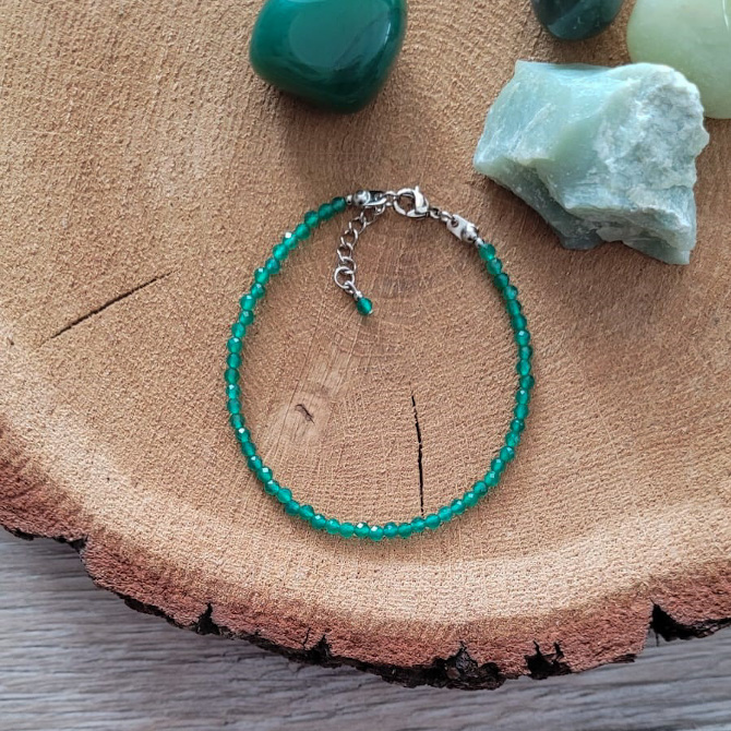 Drobne kamienie przyciągają wzrok soczystym odcieniem żywej, intensywnej zieleni! Szlif fasetowy sprawia, że minerały pięknie odbijają światło, dzięki czemu bransoletka idealnie wpisuje się w trend minimalistycznej, a jednocześnie eleganckiej biżuterii. Bransoletka wykończona została łańcuszkiem regulacyjnym z ozdobnym onyksem i kuleczką ze stali szlachetnej. Dzięki temu zakup na prezent jest bezpieczny, a bransoletka zyskuje opcję regulacji.