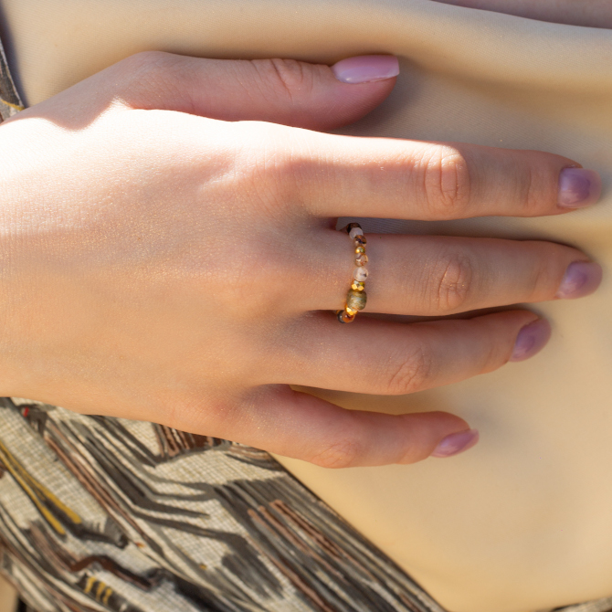 Beże, brązy, pomarańcz i odrobiona zieleni w ciepłych odcieniach. Pierścionek z agatem i frenitem wygląda jak skąpany w promieniach wiosennego słońca i w nich właśnie będzie lśnił najpiękniej! Całość uzupełniona gładkimi kuleczkami i fasetowymi przekładkami ze stali szlachetnej.