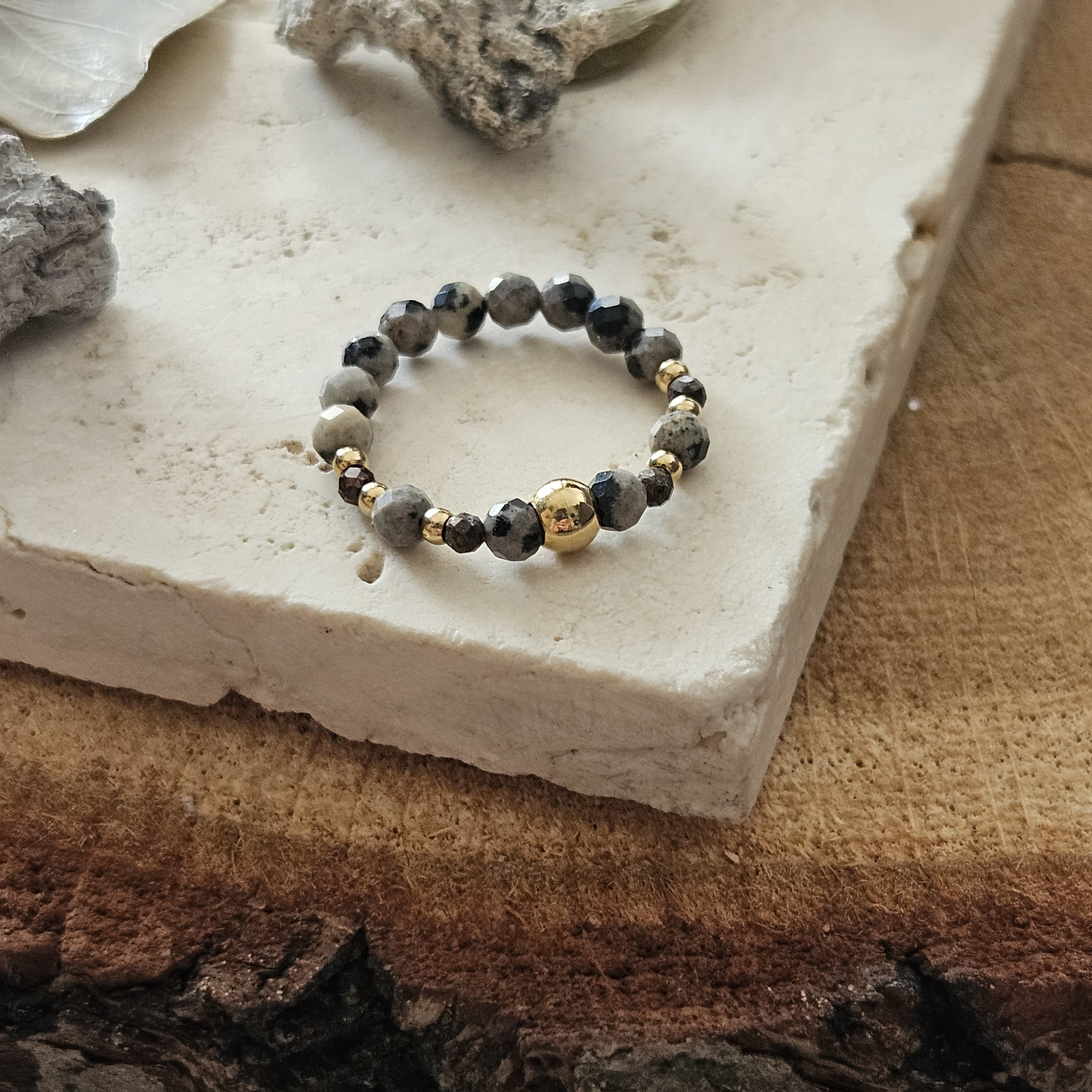 Elastyczny pierścionek z jaspisem dalmatyńskim i bronzytem