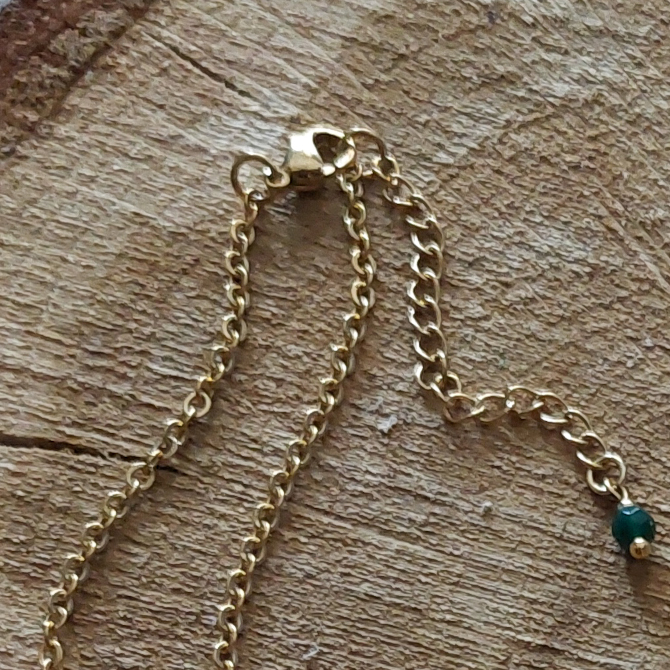Zawieszka wykonana ze stali szlachetnej w kolorze złotym przyozdobiona została kamieniami w różnych odmianach zieleni – jest tu intrygujący frenit z czarnymi wrostkami, jasnozielony apatyt i jadeit w butelkowym odcieniu. Całość osadzona została na łańcuszku z dodatkową regulacją, dzięki czemu możesz wygodnie dopasować naszyjnik do każdej stylizacji.