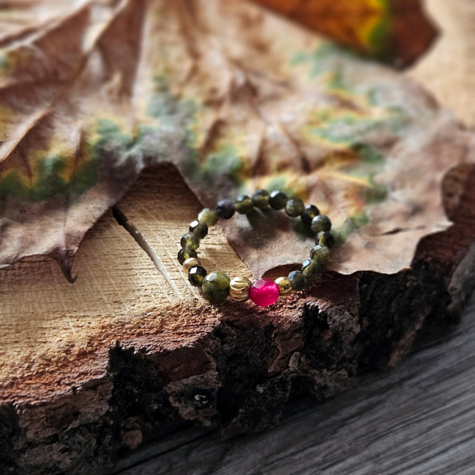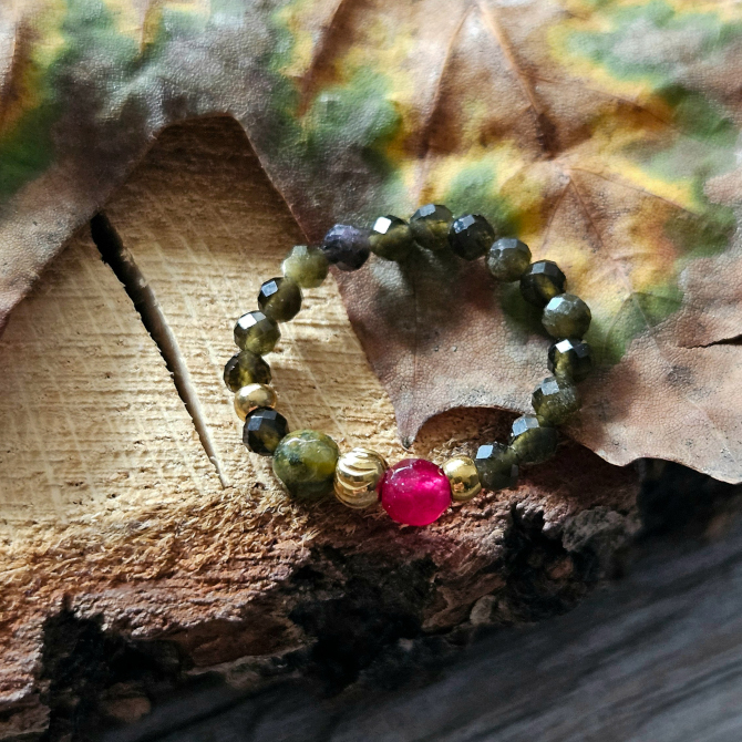 Elastyczny pierścionek wpisujący się w jesienny klimat. Obsydian złocisty i agat czarują pięknymi odcieniami zieleni, a jadeit stanowi mocny kontrapunkt w postaci intensywnej czerwieni. Na nudę nie pozwala także forma - znajdziesz tu odrobinę nonszalanckiej asymetrii i dodatki ze stali szlachetnej o różnych kształtach i fakturach. Ten model jest unikatowy, powstał tylko 1 egzemplarz, świetnie więc sprawdzi się w formie wyjątkowego prezentu.